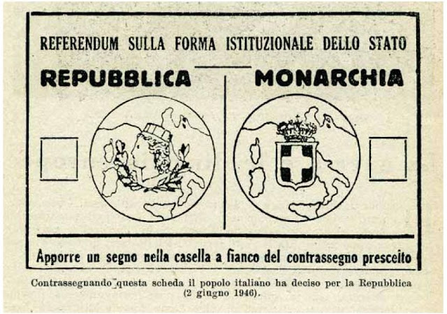 Di conseguenza alla liberazione totale dal sistema fascista della nazione italiana, e con il ritorno ad una nazione democratica, fu indetto un referendum a suffragio universale (per la prima volta comprese le donne), per far decidere agli italiani la forma di Stato che più ritenessero consona, tra Repubblica e Monarchia.